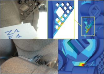 Simufact Additive 可識別制造階段和后處理操作過程中因零件變形引起的潛在問題、與二次涂覆機碰撞的風險以及零件本身或零件附屬支撐結(jié)構(gòu)的潛在失效風險。 圖 1 和圖 2 舉例說明了在增材制造過程中可能發(fā)生的兩種失效類型:在制造過程中粉末床中的 3d 打印機刮刀/工件碰撞,以及在制造過程中因零件中的固有應(yīng)力而在 3d 打印期間形成大規(guī)模裂紋。
