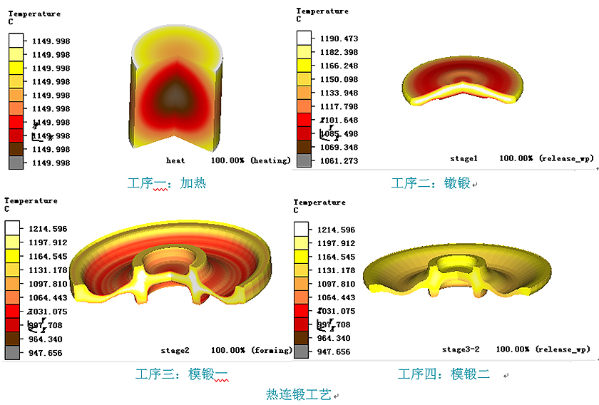 從加熱分析到多次鍛壓工序,每次仿真分析都考慮上一工序的溫度、應(yīng)力、應(yīng)變等結(jié)果分布,保證了和實際分析的對應(yīng),充分考慮各工序的變形過程和變形結(jié)果。
