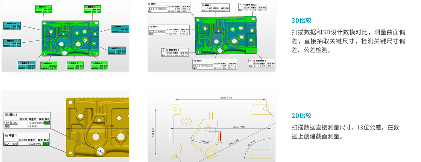 三維掃描檢測設備在不對掃描工件造成磨損破壞的前提下提供可靠、真實的三維數(shù)據(jù)信息;可將得到的三維數(shù)據(jù)與三維圖紙進行比對,快速準確地獲取工件各個位置的偏差,從而基于比對結果給出修正方案;對于掃描死角少,復雜的曲面,同軸度,圓柱度等用傳統(tǒng)方法難以獲取檢測的數(shù)據(jù),也都可以輕而易舉地獲取;同時,快捷的掃描也可以提高檢測的效率,減少時間和人力成本。